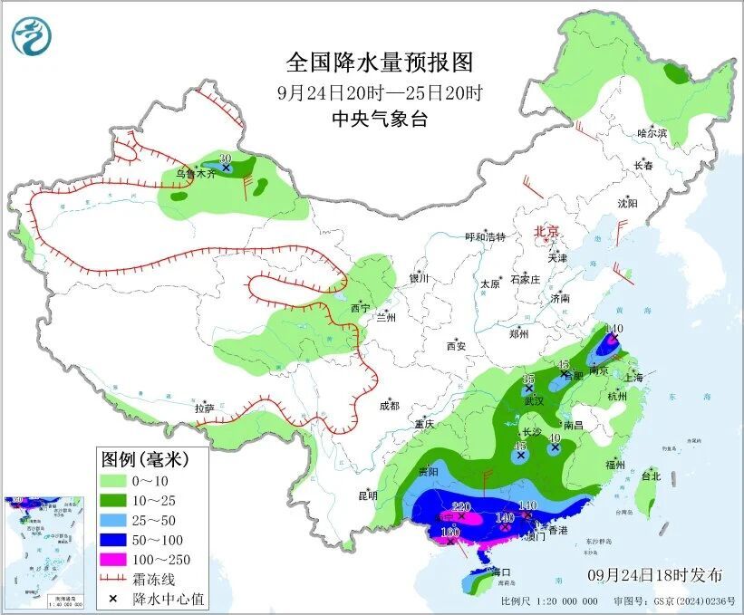 5)台风“桦加沙”已登陆广东,江淮黄淮等地有较强降水。9月24日20时至25日20时,广东大部、广西大部、海南岛北部和西部、贵州南部、云南东南部、江苏中部等地有大到暴雨。